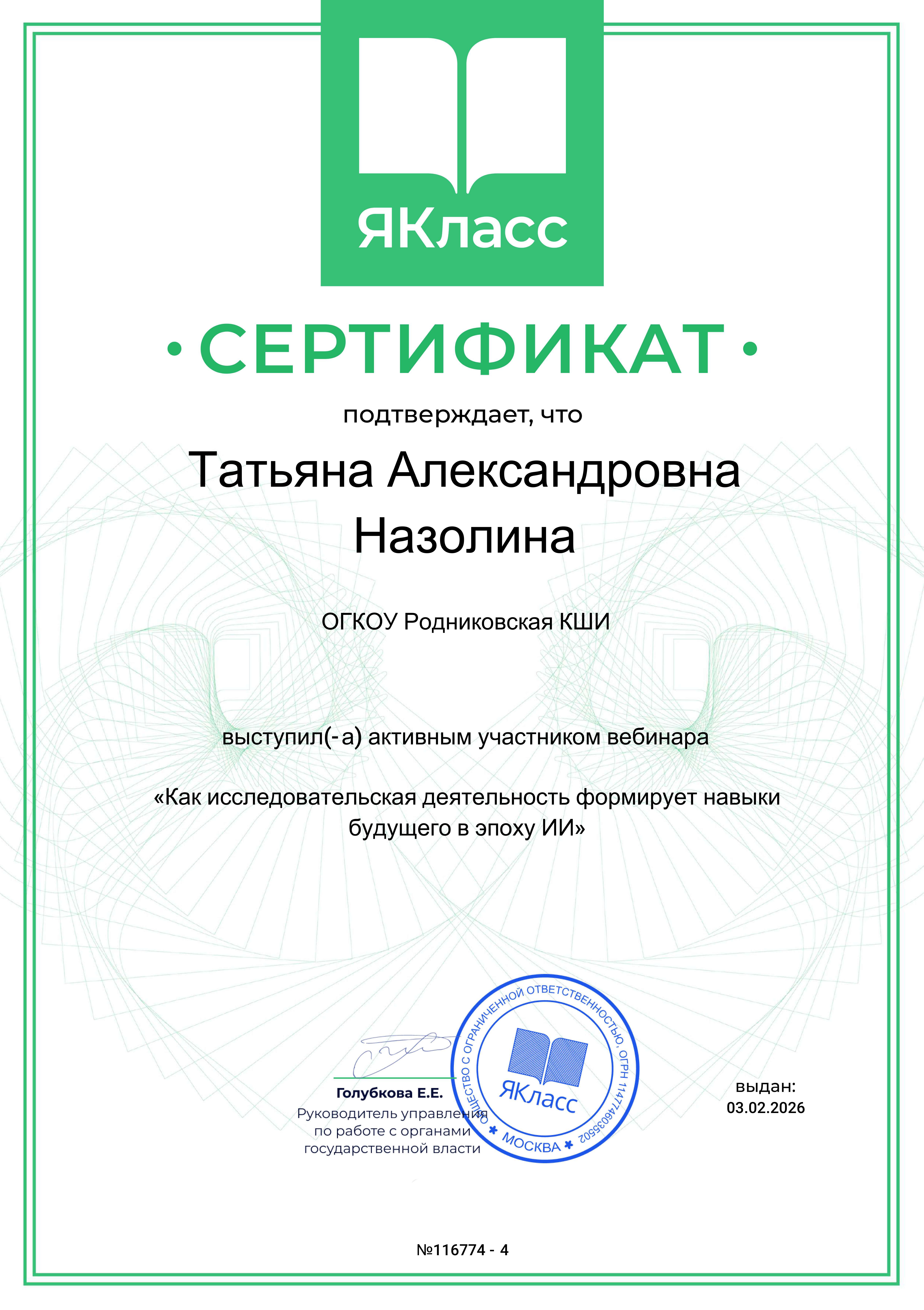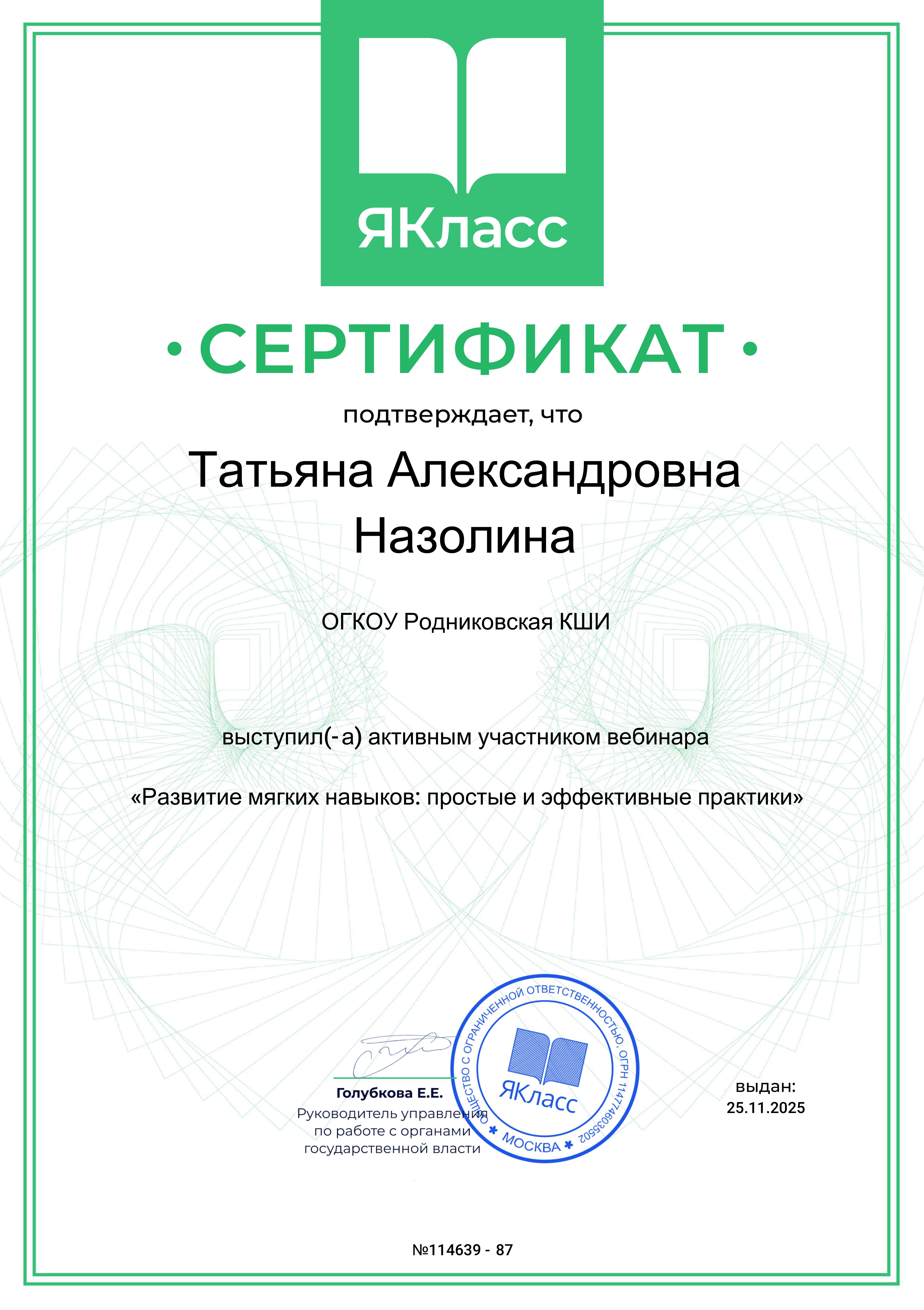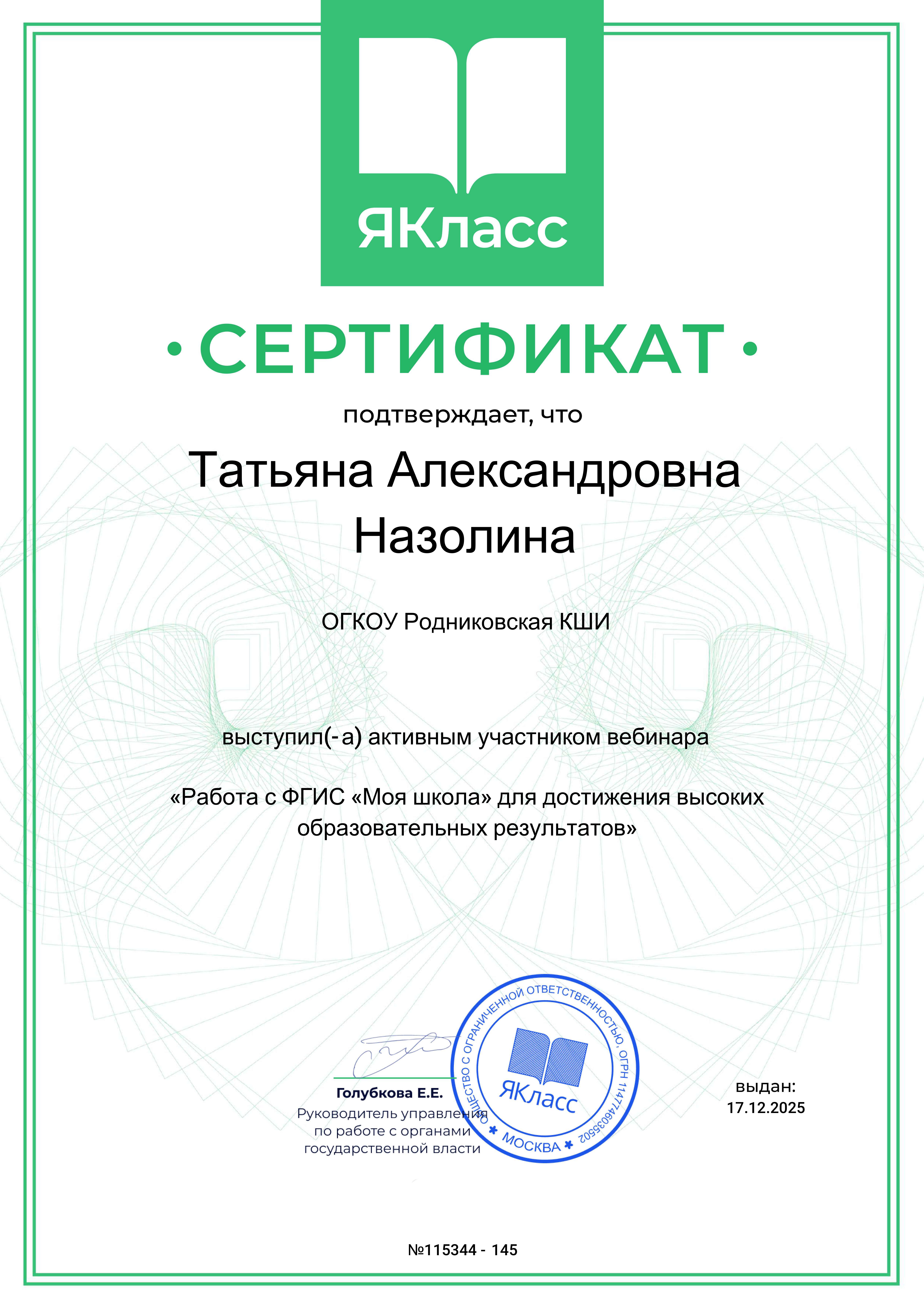 Сертификат за участие в вебинаре "Цифровые решения "ЯКласс"