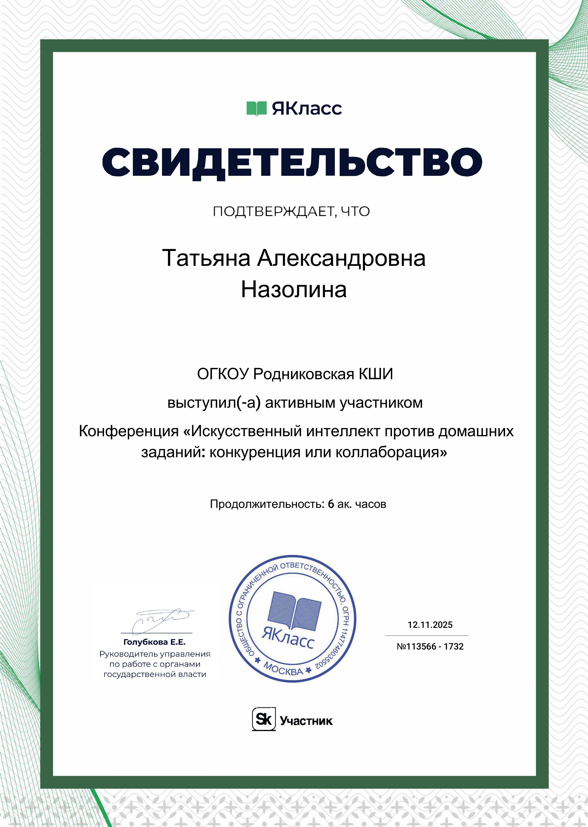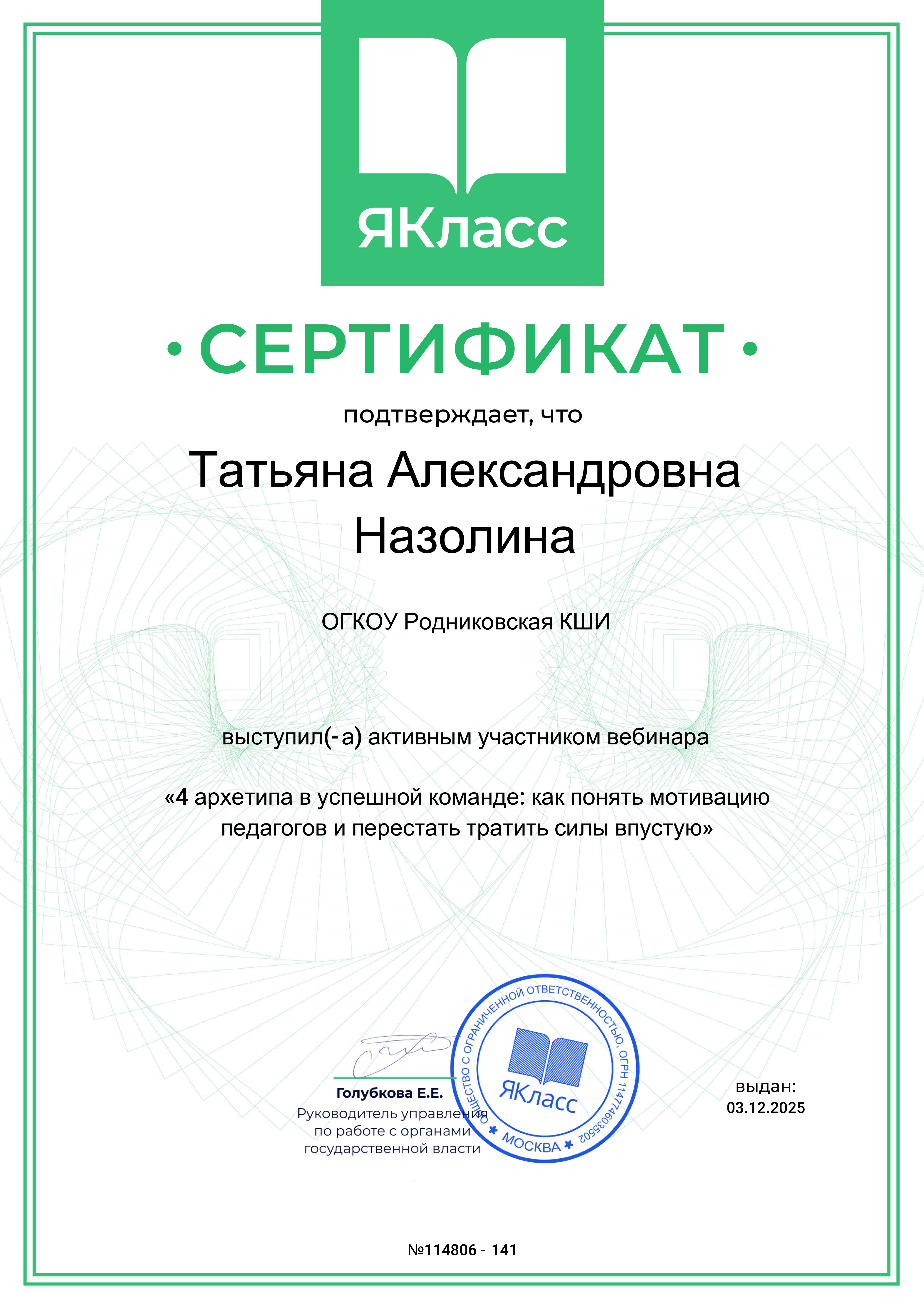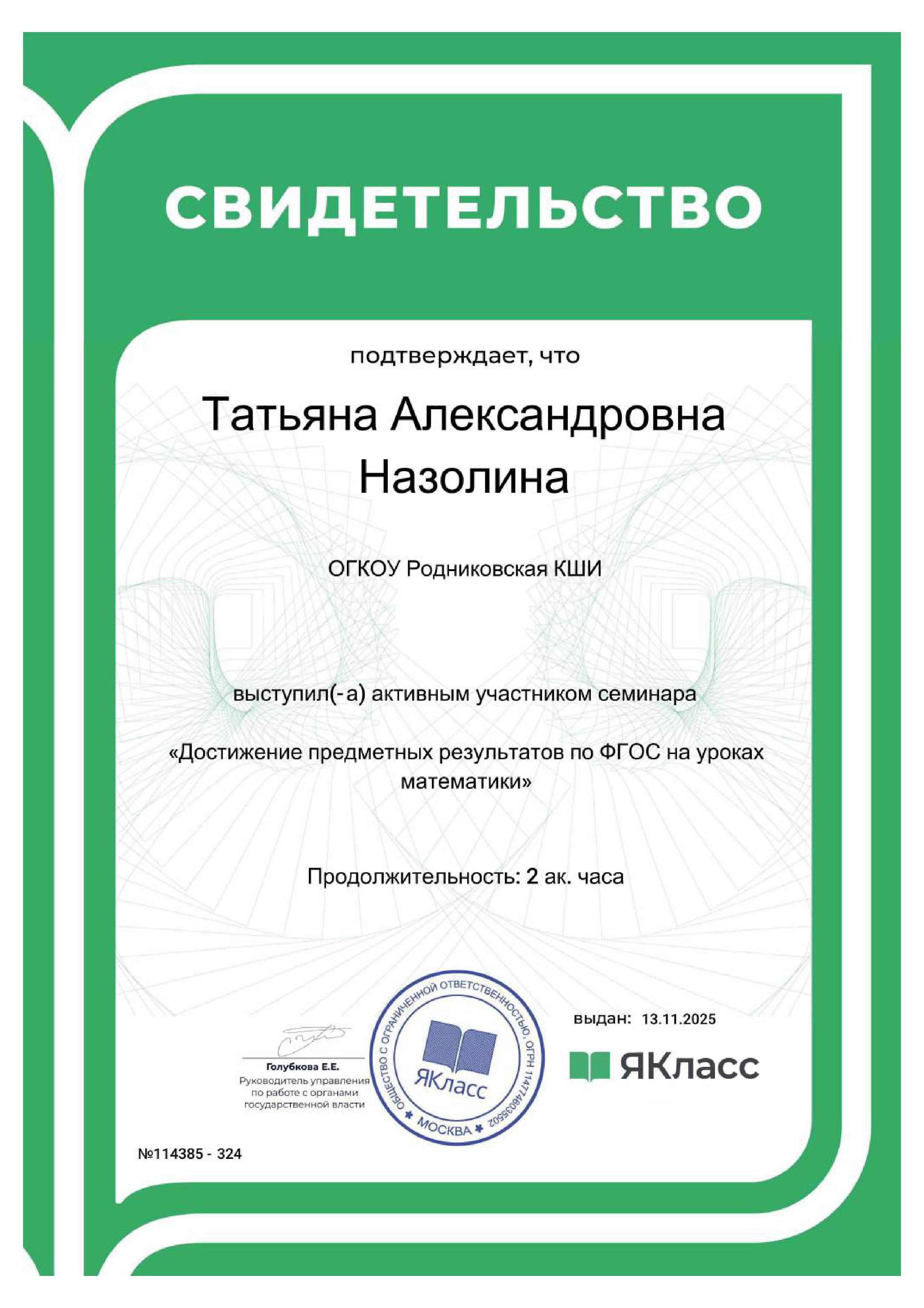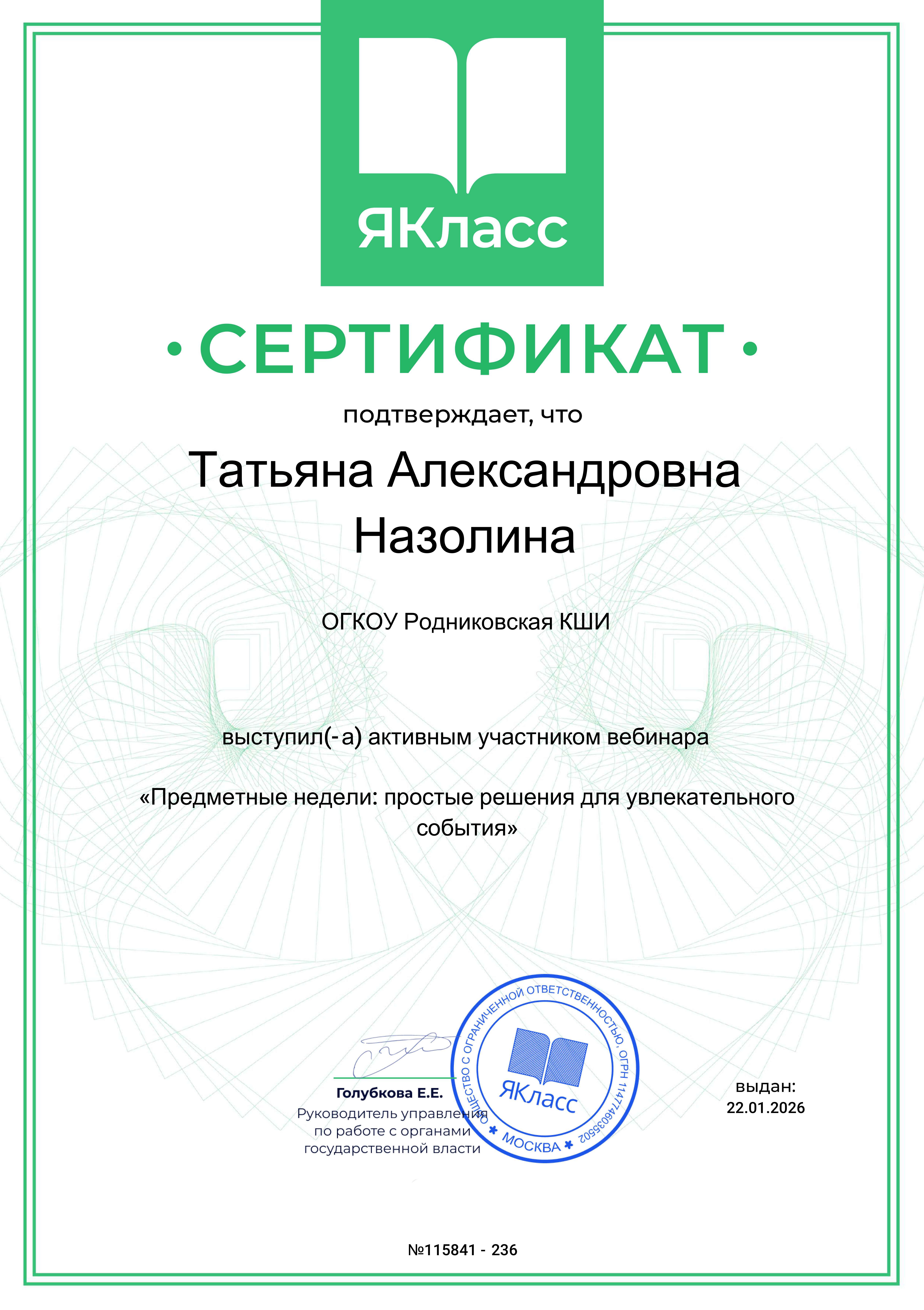 Сертификат за участие в вебинаре "Цифровые решения "ЯКласс"